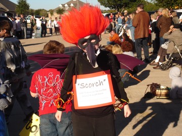 The assignment included the student deciding on a way to define the word in costume and making the costume (or most of it) himself. My son had a definite opinion about how "scorch" should be defined and designed. He made the dragon mask and the pipecleaner flames for his wrists and he picked out the wig in a funky costume shop in Austin a couple of weeks before the parade.