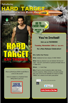 I'm having a HARD TARGET Release Day Celebration! If you're a fan of protective alpha male heroes, romantic suspense, and action-packed plots—you don't want to miss the party. I'll be chatting on my Facebook page Tuesday, November 12 from 12pm-9pm EST with some of my favorite author friends. Guests include: Colleen Thompson, Kat Baldwin, Laura Kaye, Lena Diaz, Liliana Hart, Lorraine Heath, and Suzanne Ferrell.